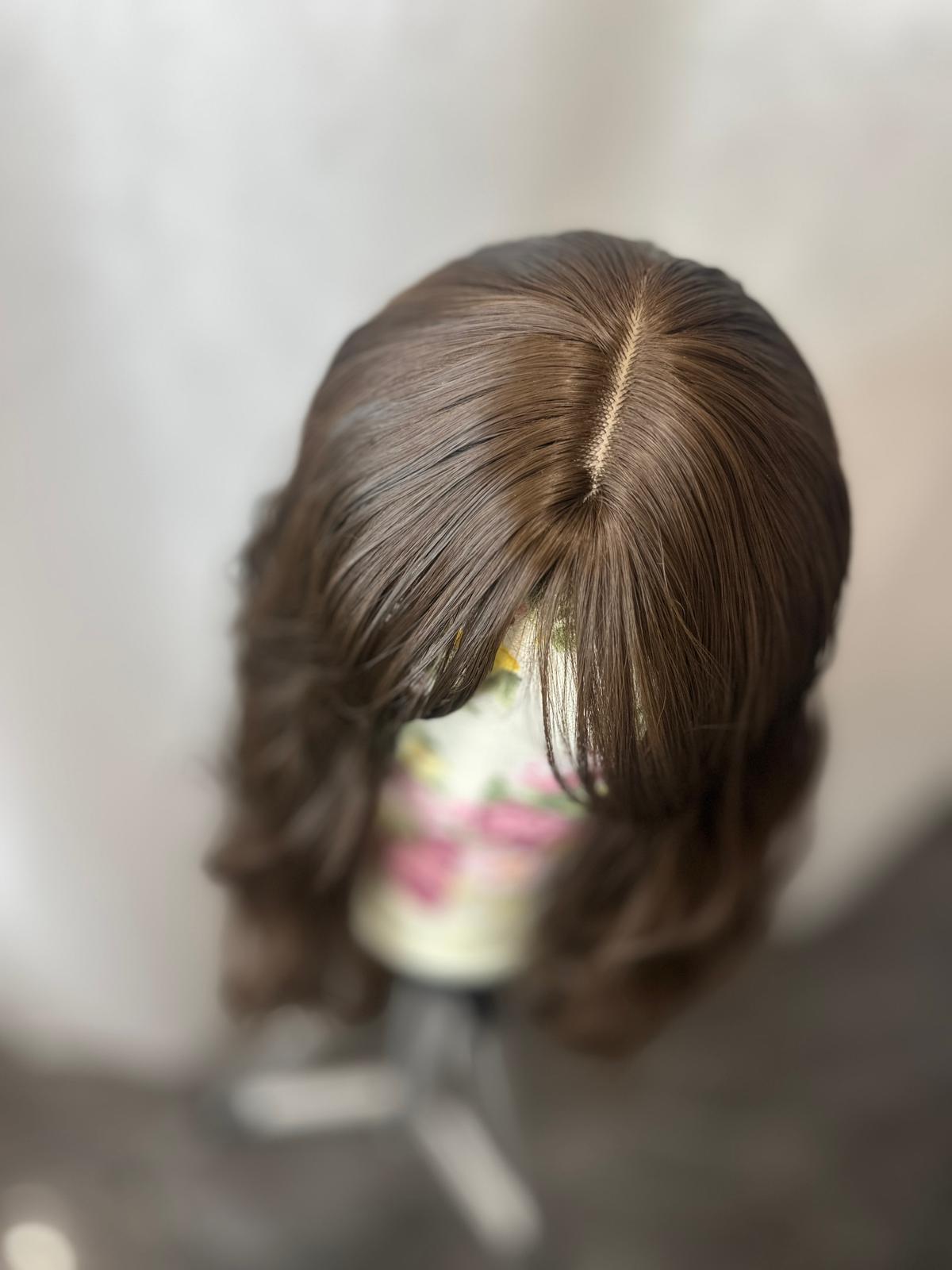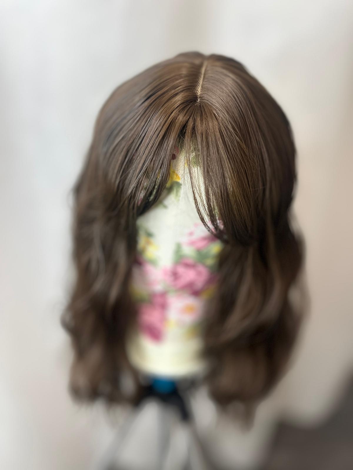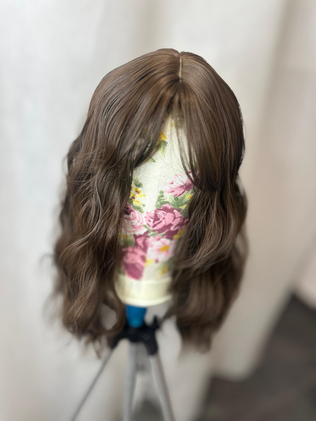 Model ma długość 35 cm i brązowy kolor, który prezentuje się naturalnie i pasuje do wielu typów urody. Delikatnie kręcona faktura nadaje fryzurze objętości i subtelnego charakteru, natomiast obecność grzywki ułatwia dopasowanie fryzury do kształtu twarzy bez konieczności dodatkowej stylizacji. Peruka nie posiada siateczki lace, dzięki czemu jest prosta w zakładaniu i pielęgnacji.