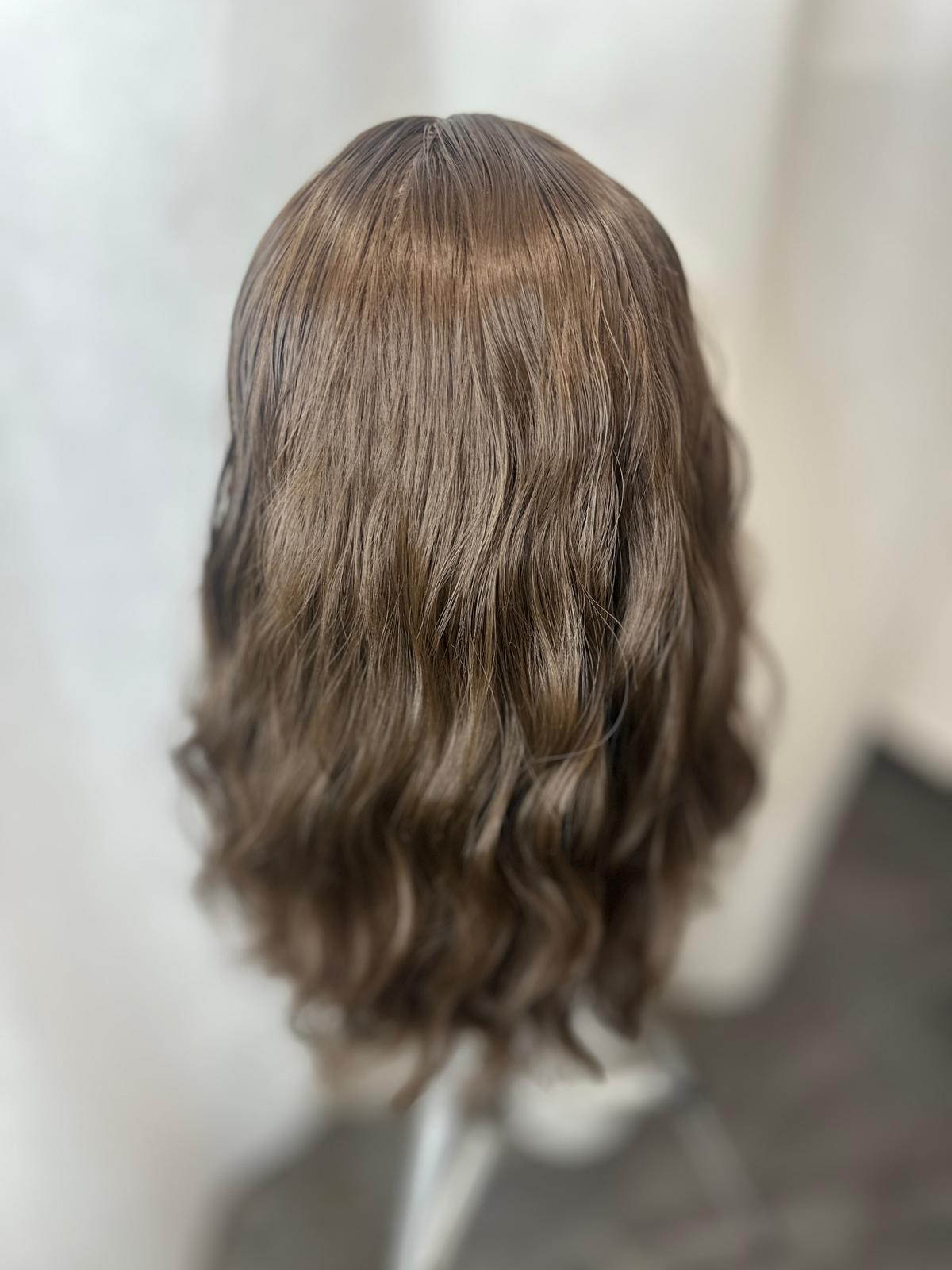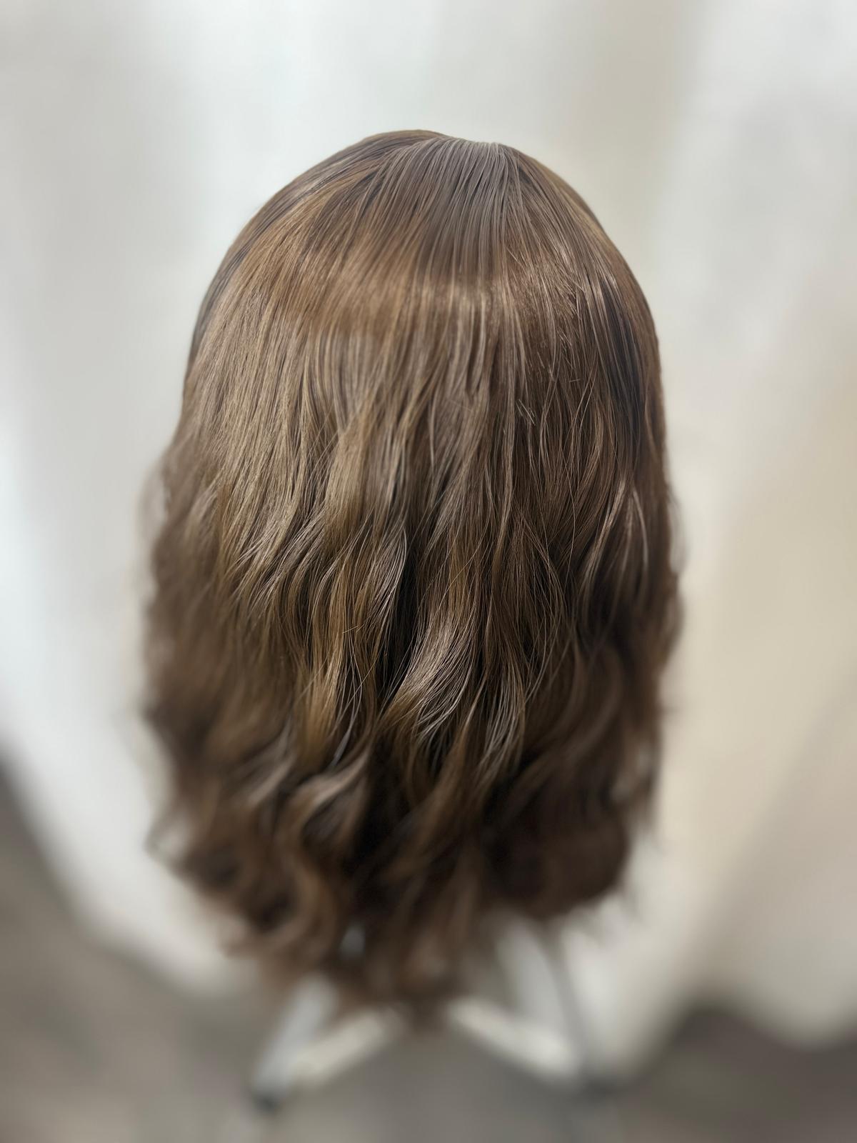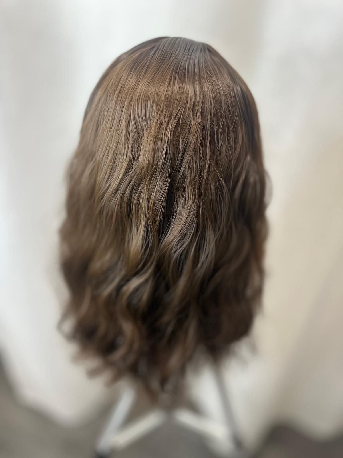 Model ma długość 35 cm i brązowy kolor, który prezentuje się naturalnie i pasuje do wielu typów urody. Delikatnie kręcona faktura nadaje fryzurze objętości i subtelnego charakteru, natomiast obecność grzywki ułatwia dopasowanie fryzury do kształtu twarzy bez konieczności dodatkowej stylizacji. Peruka nie posiada siateczki lace, dzięki czemu jest prosta w zakładaniu i pielęgnacji.