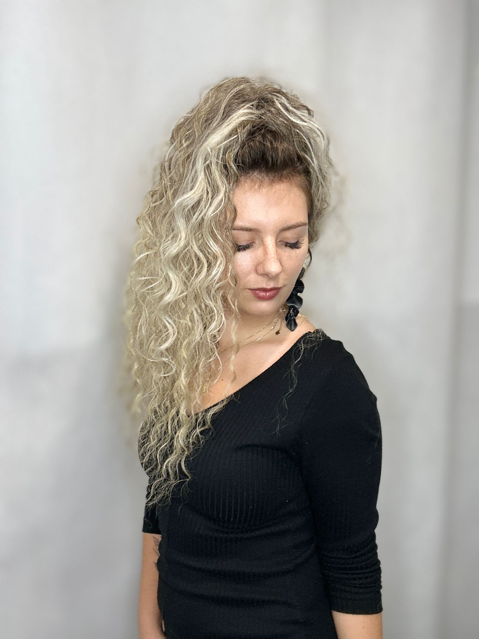Afro krab w odcieniu ombre łączącym chłodny blond i brąz z delikatnymi, jasnymi refleksami. Długość 40–50 cm, cieniowany dla naturalnego efektu. Wykonany ręcznie, z możliwością drobnej personalizacji.